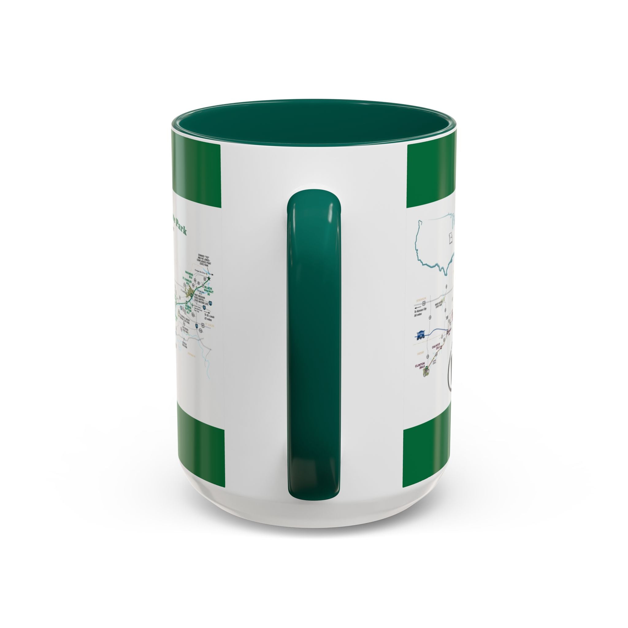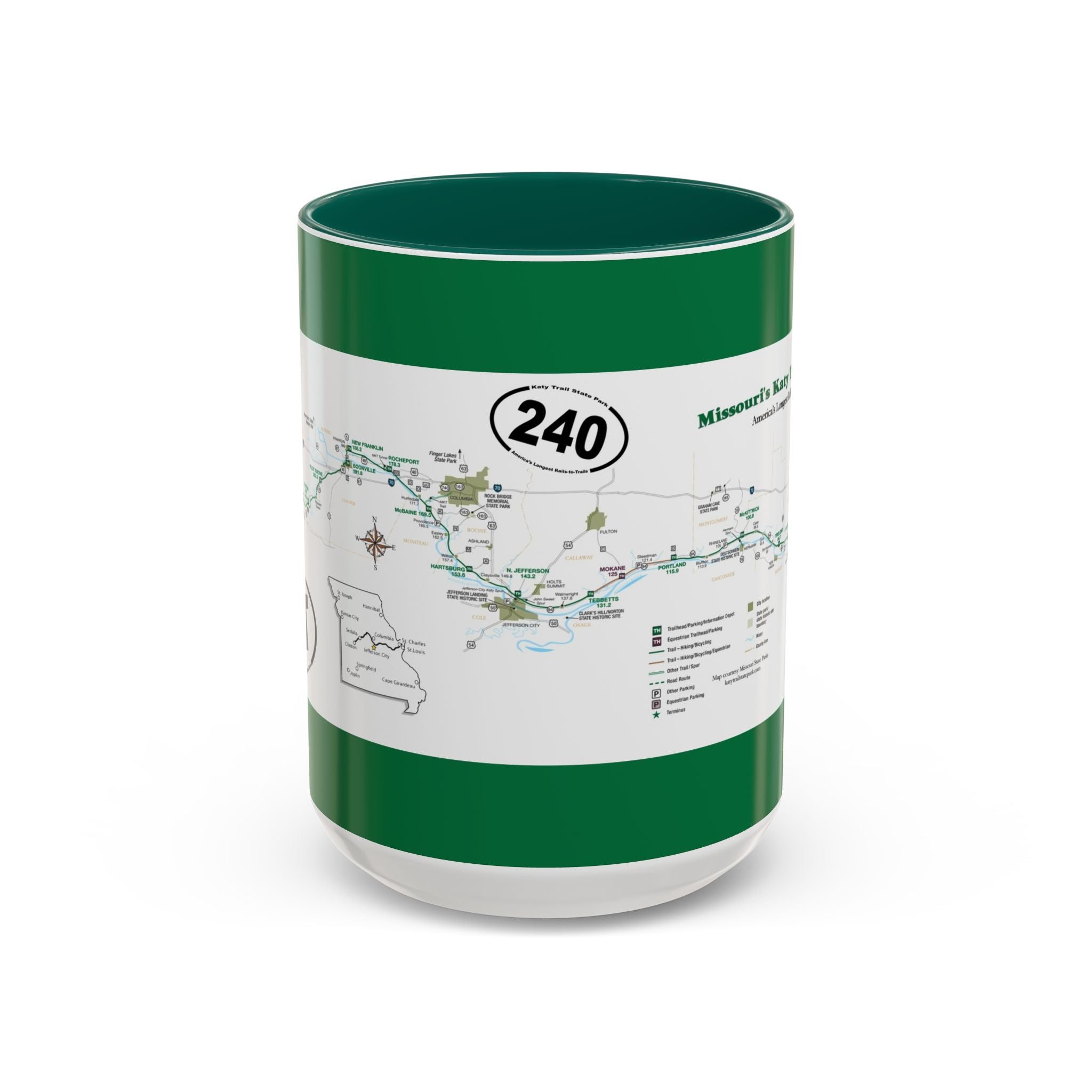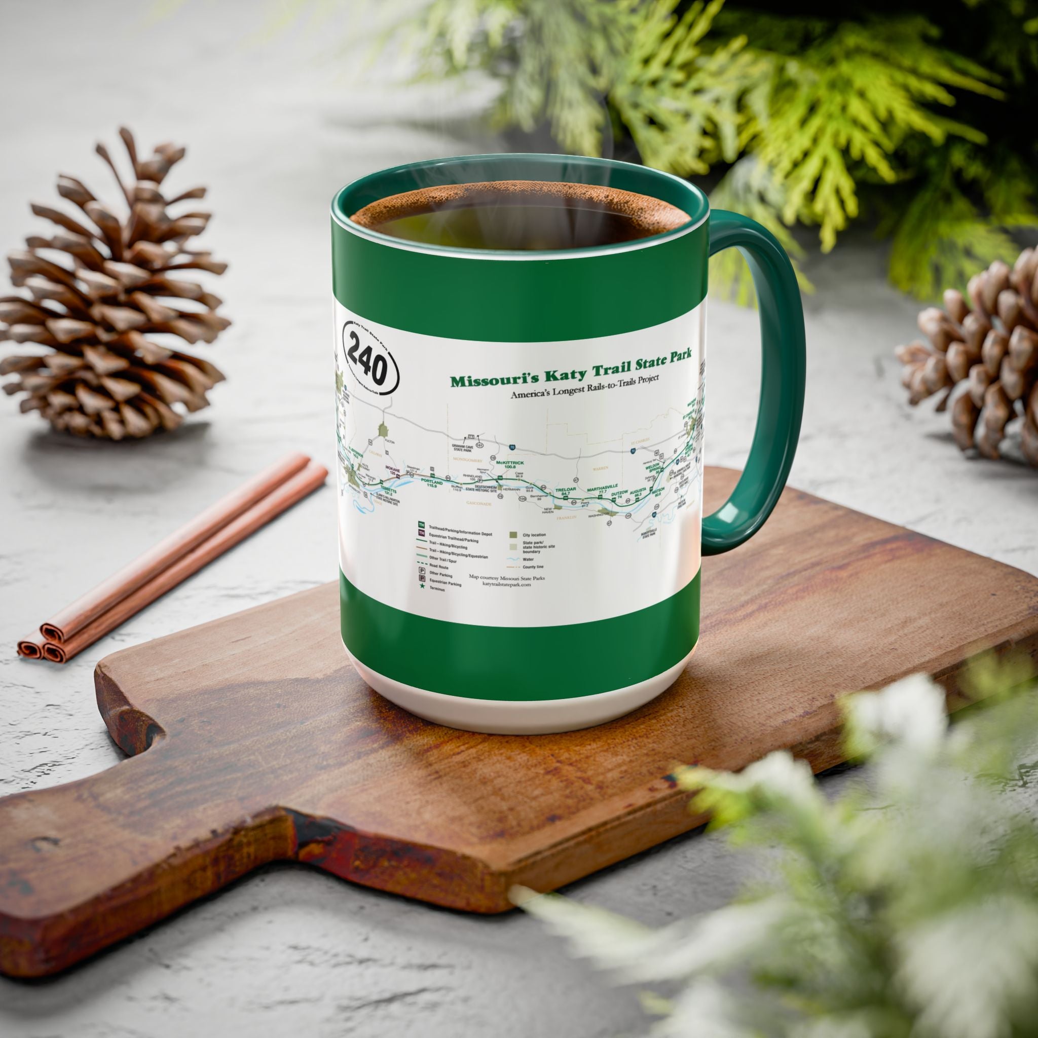 A vibrant and colorful Katy Trail map mug perfect for planning your biking rails-to-trails adventure in Missouri on America's longest rails-to-trails project!