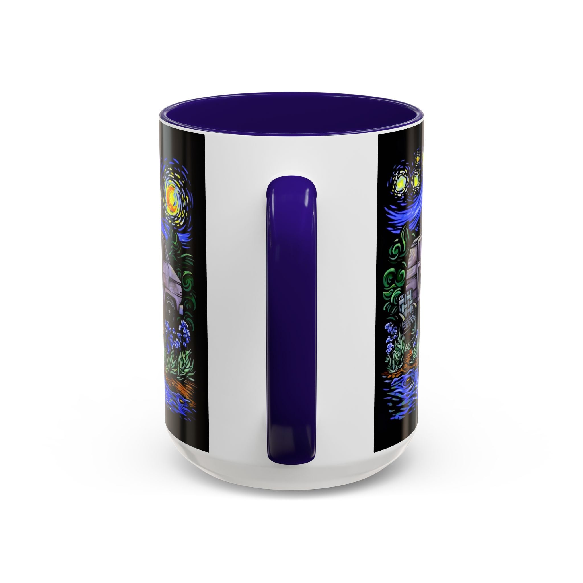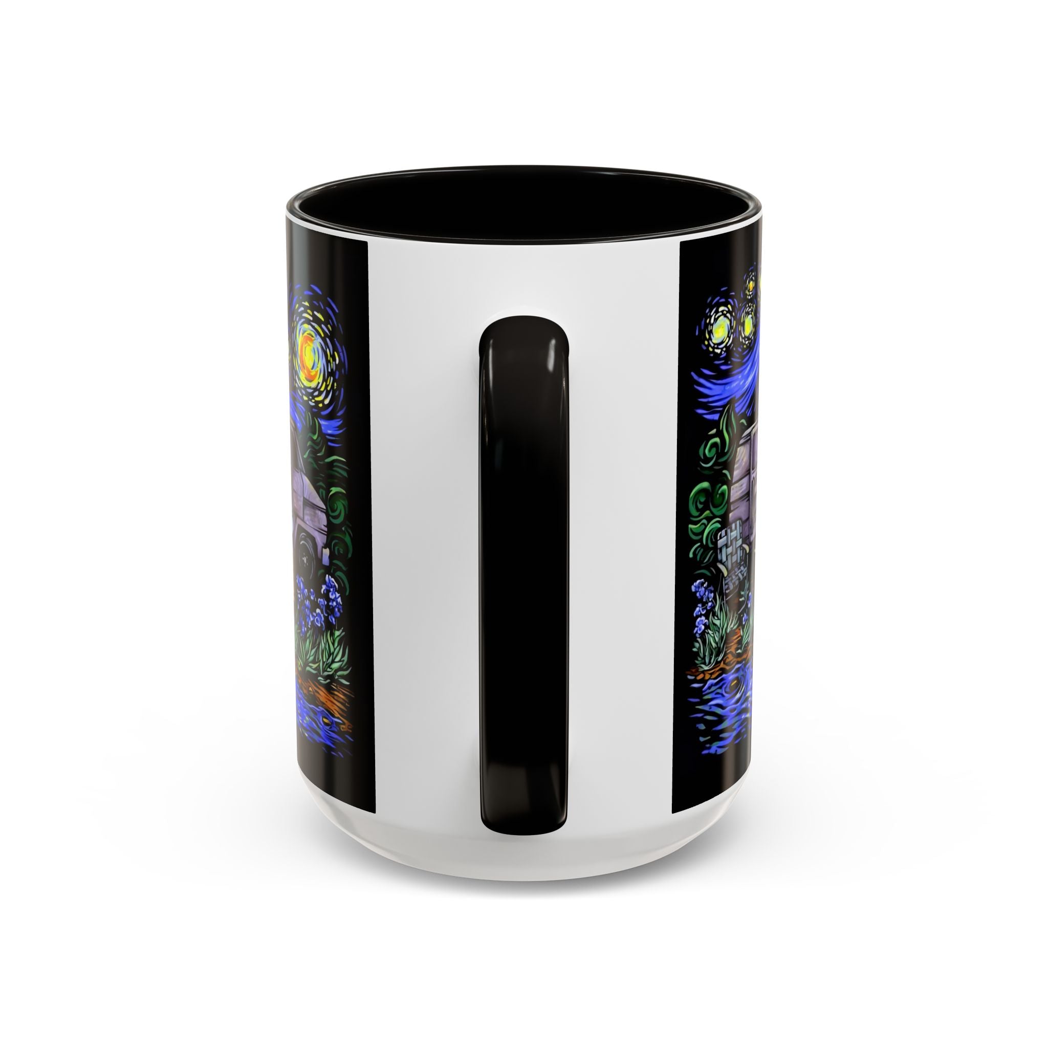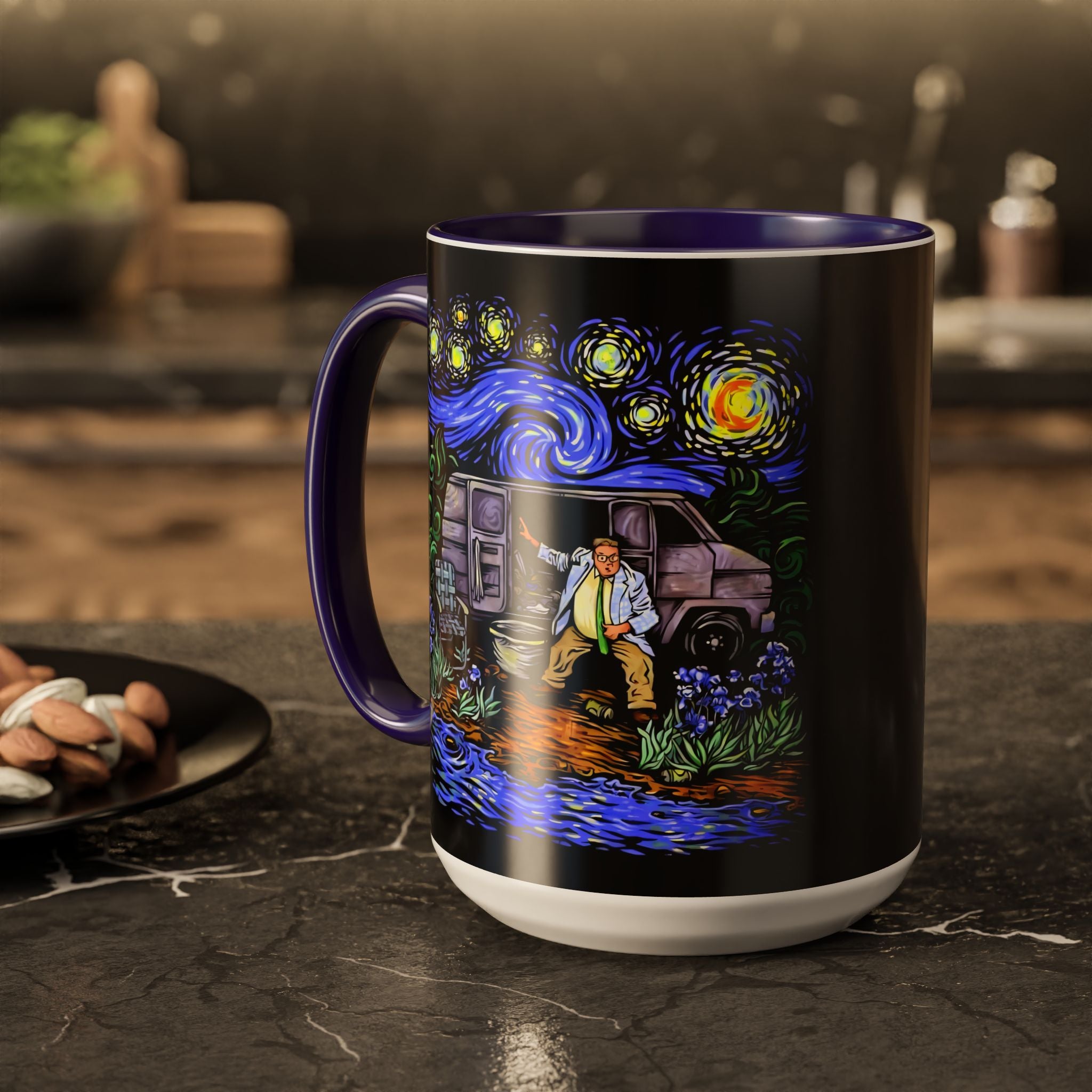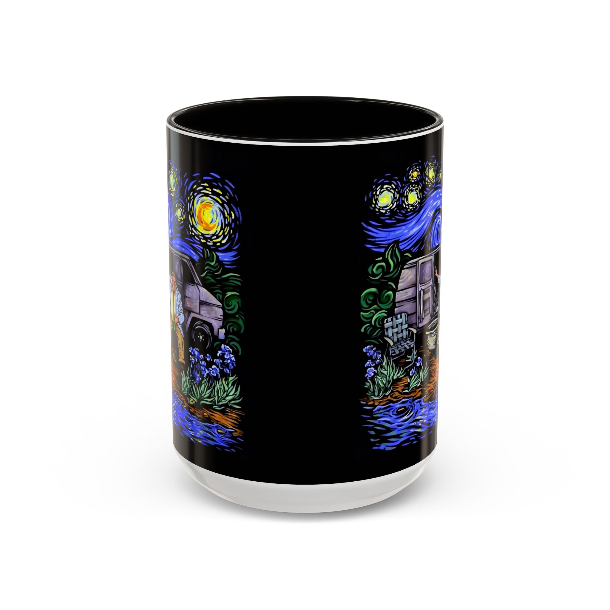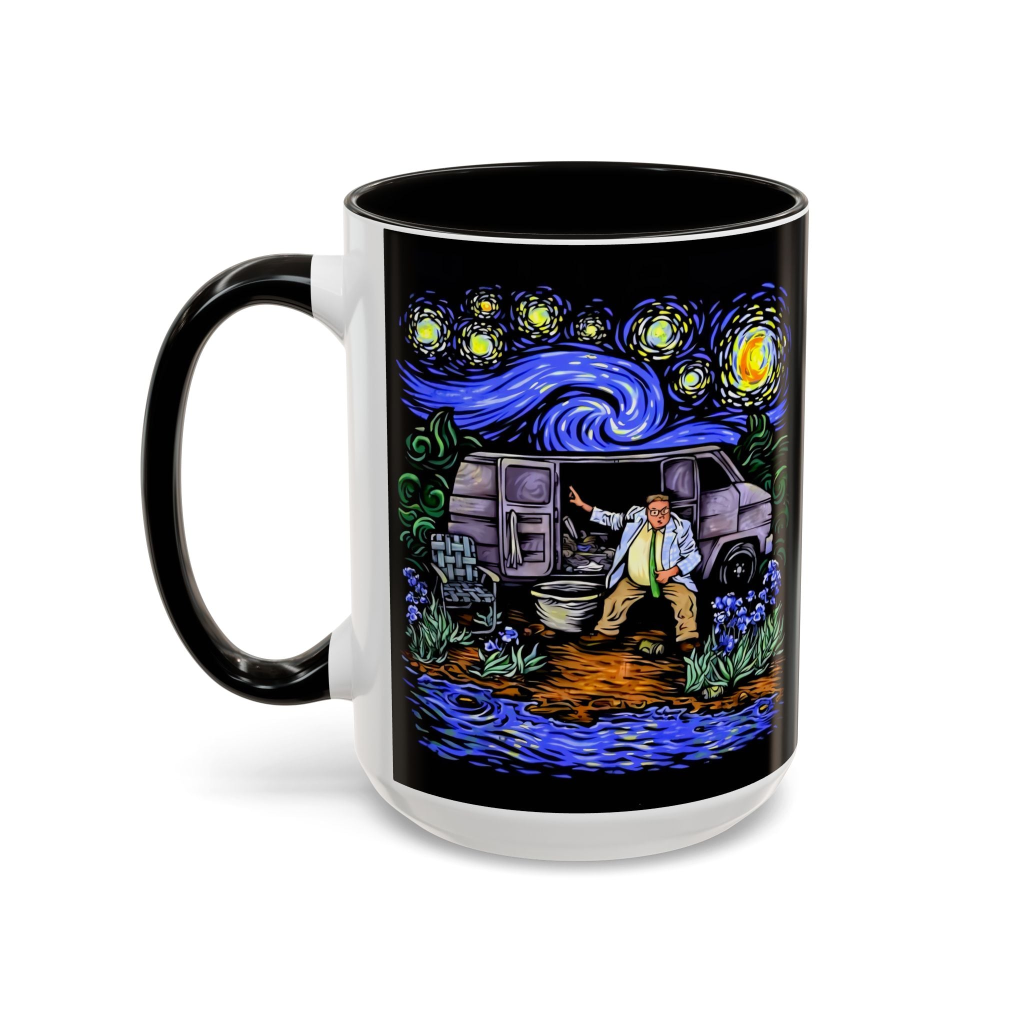 Van Down By the River with stylized Starry Night scene. a mug sure to bring chuckles to anyone who loves that famous Chris Farley Saturday Night Light (SNL) skit about living in a van down by the river. A perfect mug for anyone about to retire, or any river lover!