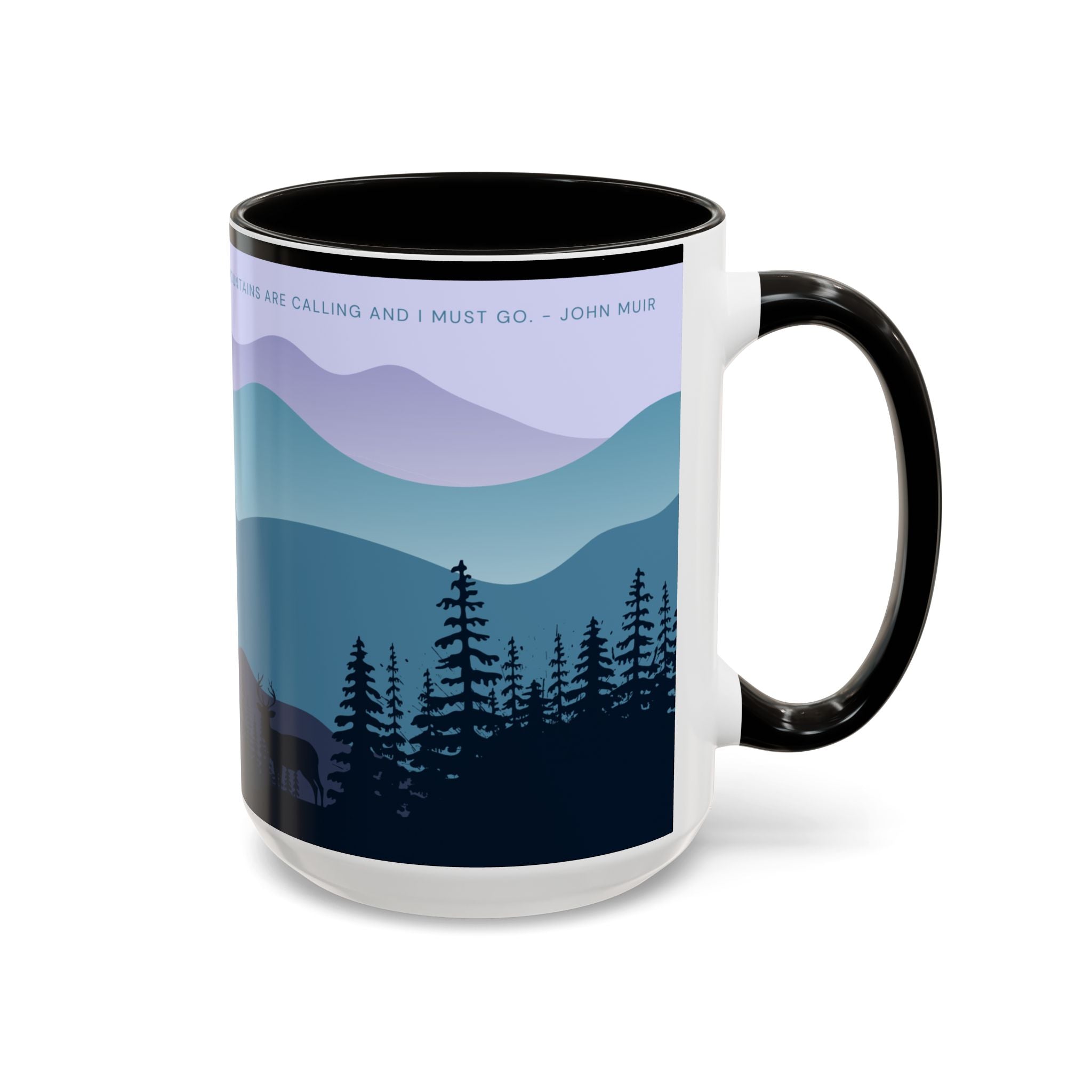 A beautiful mountain scene with elk and the famous quote by John Muir, "The mountains are calling and I must go," in soothing colors. This mug gives off a peaceful and adventurous vibe, perfect for nature lovers and outdoor enthusiasts. Ideal for mountain lovers, hikers, and those who seek inspiration from nature. Perfect for gifting during birthdays, holidays, or as a motivational gift.